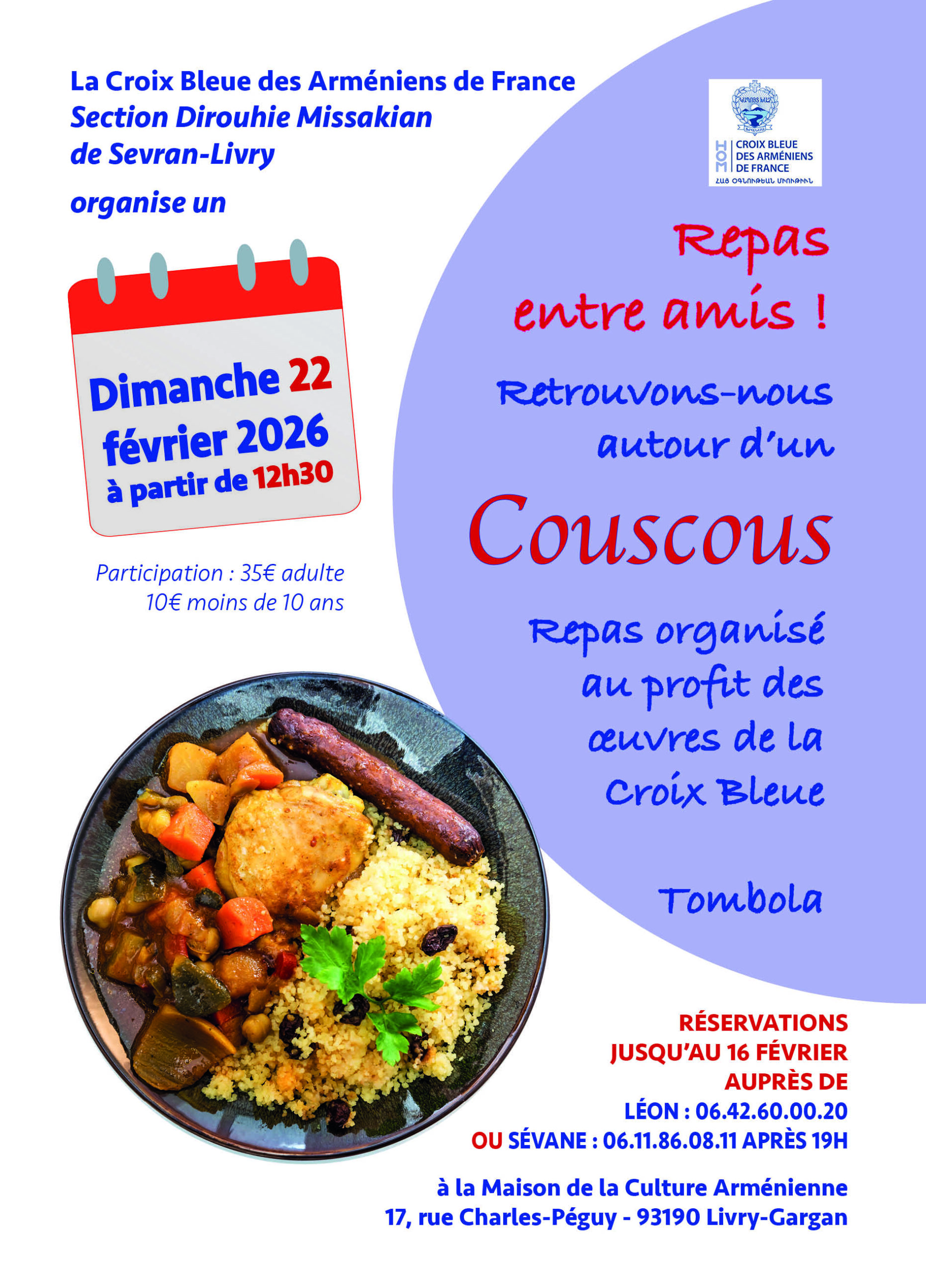 Repas entre amis ! La section Dirouhie Missakian de Sevran-Livry de la Croix Bleue des Arméniens de France vous propose de se retrouver autour d’une [...]