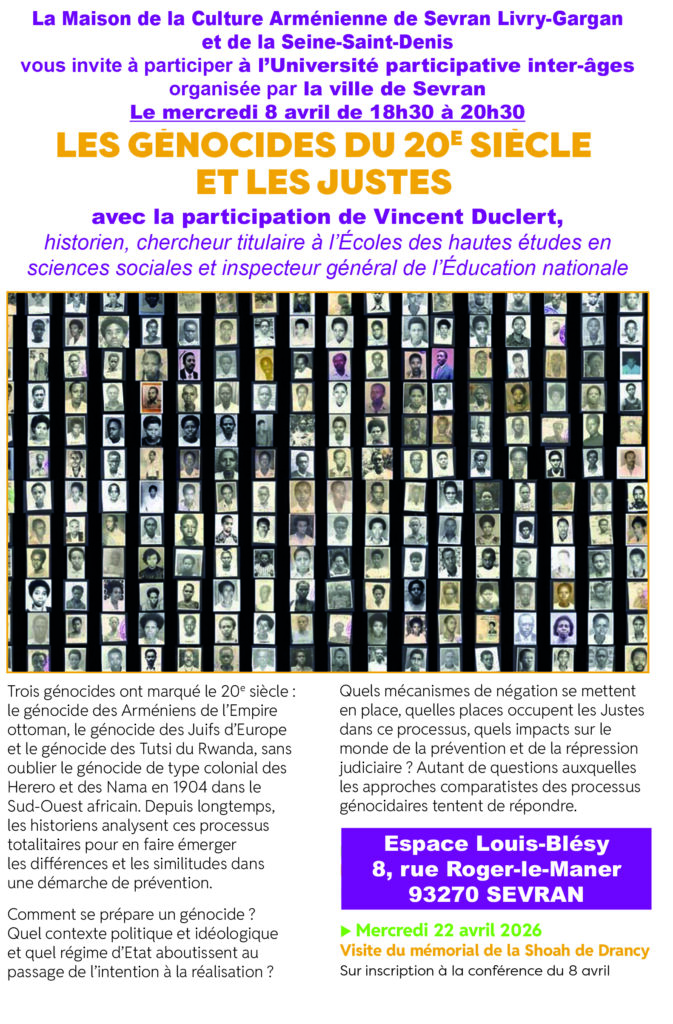 LES GÉNOCIDES DU 20E SIÈCLE ET LES JUSTES – Le 8 avril à 18h30 à Sevran