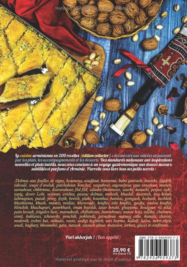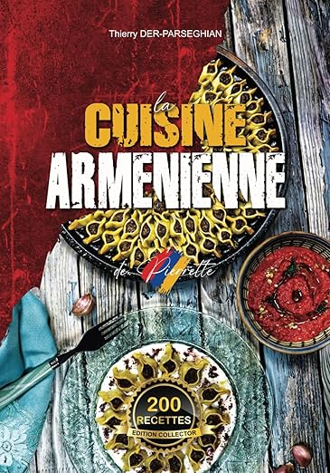 La cuisine arménienne de Pierrette en 200 recettes et 200 photos (édition collector – 250 pages) : des mezzés aux entrées en passant par les plats, les accompagnements et les desserts. Des standards nationaux aux inspirations nouvelles et plats inédits (Hay burger, macarons au basterma, etc.), nous vous convions à un voyage gastronomique aux douces saveurs, subtilités et parfums d’Arménie.